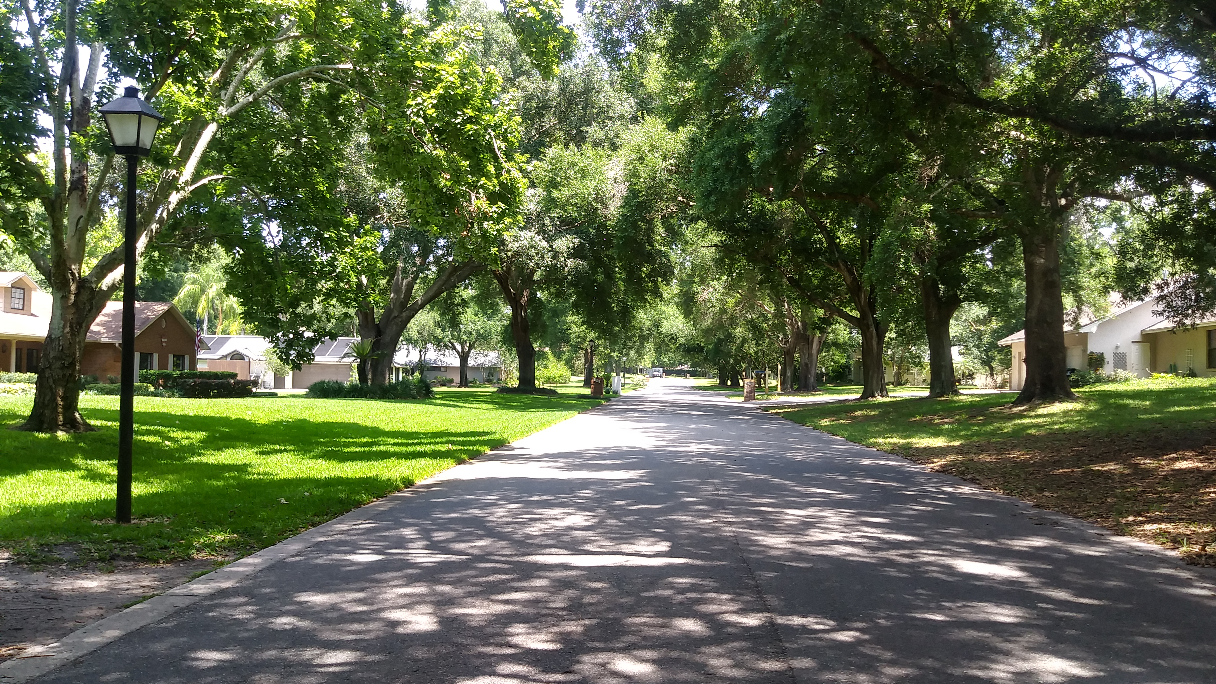 A quiet suburban street lined with large, leafy trees casting shadows, with houses on both sides and sunlight filtering through the branches onto the pavement—an ideal setting to explore with Rich Noto Realtor.