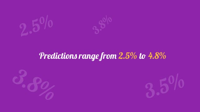 Text on a purple background reads: “Predictions range from 2.5% to 4.8%,” with the numbers 2.5%, 3.5%, and 3.8% faintly appearing in various places around the text.