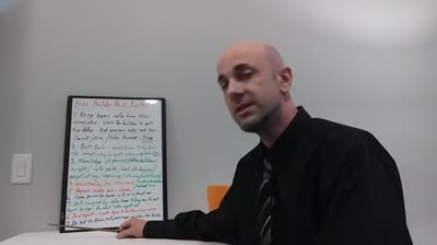 A man in a black shirt and tie sits at a table, pointing to a whiteboard with colorful handwritten text titled Free Rules That Work in the background. The setting appears to be an office or classroom, possibly where Rich Noto Realtor gives advice.